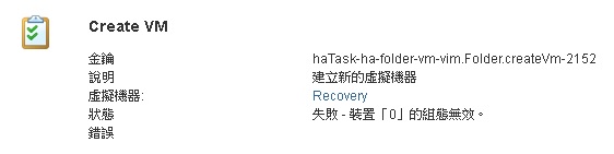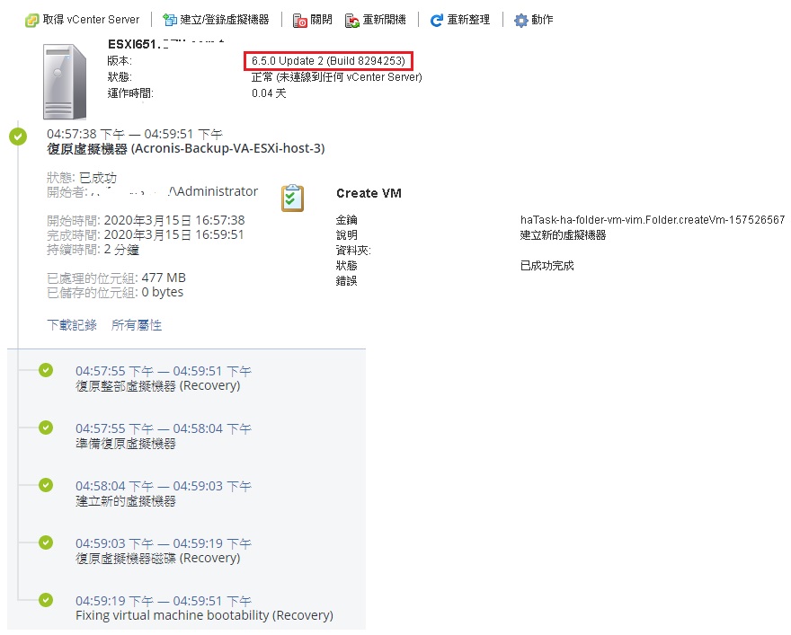 (VMWARE) (Backup & Recovery) – Acronis Backup 12.5 在ESXI 6.7環境下復原時無法建立虛擬機問題 March 15, 2020 最近有聽朋友說測試Acronis Backup 12.5在Restore建立虛擬機器的過程中會發生錯誤的情況,所以請我協助幫忙另外再測試一下 Solution : 1. 查看ESXI紀錄,則是顯示裝置0的組態無效訊息 (跟朋友一樣) 2. 而在Acronis官網上也有詳細記載此問題,看來只能等未來新版Acronis可以修正囉 3. 我這邊再另外測試ESXI 6.5 U2環境下是可以正常Restore的 ◎ 結論:若是採用ESXI 6.7的使用者以目前現階段只能手動Create新的虛擬機器後,透過掛載ISO方式(Acronis Backup 12.5救援)來直接還原虛擬機器,操作上會比較麻煩一點,就等未來Acronis官方這邊可以解決囉。 Related Posts:vSAN Data Protection in VMware Cloud Foundation –…The VCF 9.0 Sessions Everyone’s Talking About From…How VMware Cloud Foundation 9 Simplifies Troubleshooting10 VMware Cloud Foundation 9 Enhancements:…Application Versus Infrastructure-Level High…Rightsizing VMs with VMware Cloud Foundation Related Articles International vSAN ReadyNode の選び方と構成のカスタマイズ – Broadcom サポートサイト利用ガイド yuki kawamitsu December 24, 2025 Modern Apps What’s Up with Bitnami? Unraveling the Myths About Your Favorite Pre-Packaged Open Source Software Catalog rita manachi and william jimenez December 22, 2025 Cloud Infrastructure 5 Key Principles of Modern Applications jad el-zein December 19, 2025 Cloud Infrastructure VCF Breakroom Chats Episode 77: Orchestrate like a Pro – Event Subscriptions and Extensibility for Every Admin with VCF 9.0 alina thylander December 19, 2025 Cloud Infrastructure Upgrading VMware Cloud Foundation 5.2 to 9.0: The Top 10 Questions Answered jonathan mcdonald December 18, 2025 Cloud Infrastructure VCF Breakroom Chats Episode 76: Cloud Admin Fast Track – Learn Infrastructure as Code the Easy Way with VCF 9.0 alina thylander December 17, 2025 Cloud Infrastructure AI and Load Balancing: Rethinking Network Infrastructure for the AI Era umesh mahajan December 17, 2025 Cloud Infrastructure Deploy VMware Private AI Services in Minimal VMware Cloud Foundation Environments Phoebe Kim December 17, 2025 Company From Ransomware to Load Balancing: These Explore Sessions Are Getting the Most Replays meisha p. December 17, 2025 Modern Apps Tanzu Platform: Still the Best Place for Enterprise Java Apps Cora Iberkleid December 16, 2025 Cloud Infrastructure NVMe Memory Tiering Design and Sizing on VMware Cloud Foundation 9 Part 4: vSAN Compatibility and Storage Considerations dave morera December 16, 2025 Cloud Infrastructure The New Paradigm: MLPerf 5.1 Confirms VCF is the Future of AI/ML Performance uday kurkure and lan vu December 15, 2025 Cloud Infrastructure What to Look for in Network Switches for VMware vSAN vmwareblogs December 12, 2025 Cloud Infrastructure VCF Breakroom Chats Episode 78: Build, Deploy, and Scale with vSphere Kubernetes Service 3.5 audrey bian December 11, 2025 International [TAM Blog] VMware Cloud Foundation® Operations 構成ドリフトダッシュボードを使ってみよう jumpei matsuhashi December 10, 2025 Cloud Infrastructure Unlocking Innovation on the Factory Floor: How VMware VCF Edge Empowers OT Citizen Developers vmwareblogs December 10, 2025 Modern Apps December 17, 2025: Modern Java Performance: AOT, Leyden & Spring Boot Acceleration on Tanzu Platform vmware tanzu team December 10, 2025 Cloud Infrastructure Erasure Codes in VMware vSAN versus Storage Arrays vmwareblogs December 10, 2025 Modern Apps The Security Gap in AI Applications: Rethinking API Protection for a New Era chris sterling camille crowell-lee and cote December 9, 2025 Cloud Infrastructure Integrating VMware Data Services Manager with Harbor for a Production-Ready Registry vmwareblogs December 8, 2025