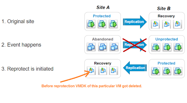 Question: What would be the Impact on re-protection if VMDK of a particular VM got deleted in Old Protected Site (Site A ). Re-protection would work or not?