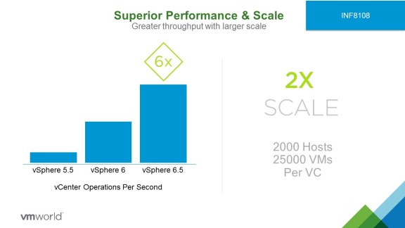 vCenter 6.5 can support 2x the inventory size as vCenter 6.0. Moreover, vCenter 6.5 provides dramatically higher throughput than 6.0, and can manage the same environment size with less CPU and memory. In this note, I have tried to give some details regarding the source of these improvements. The gains are due to a number of significant architectural improvements (like removing the Inventory Service caching layer) as well as a great deal of low-level code optimizations (for example, reducing memory allocations and shortening critical sections). I have also provided some details about our benchmarking methodology as well as the hardware and software configuration.