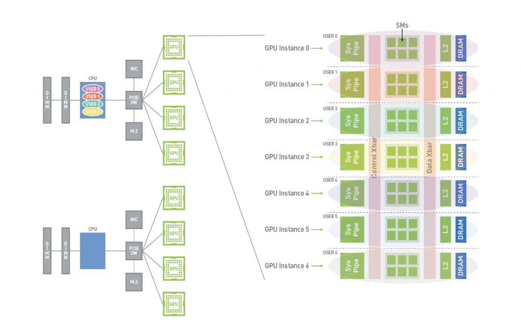 We already understand from part 1 that a GPU Instance represents a slice of a physical GPU capturing memory, a fraction of the overall streaming multiprocessors (SMs) or cores and the hardware pathways to those items, such as the crossbars and L2 cache. As a reminder, we include the outline MIG architecture again here for your reference.