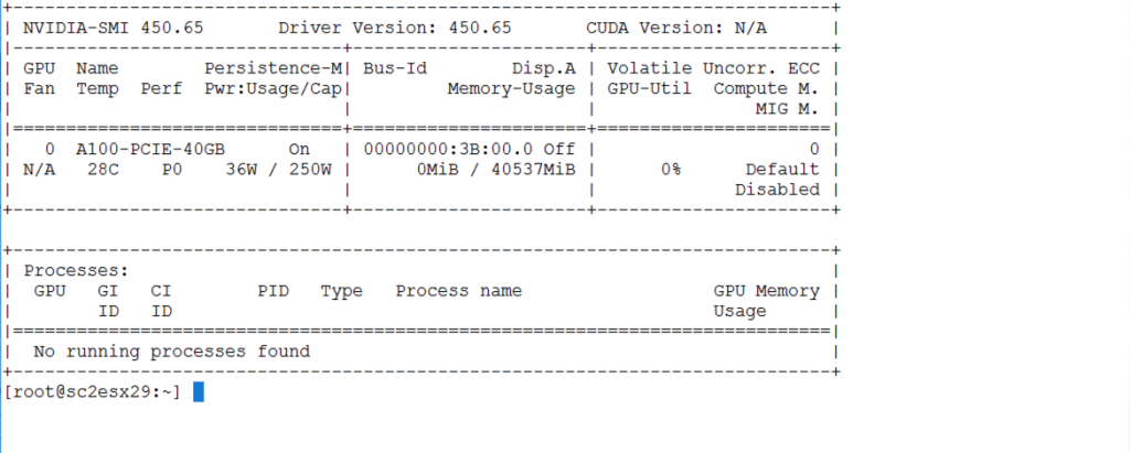 If an NVIDIA ESXi Host driver is currently installed at one of the 450.xx versions, i.e. with CUDA 11 support, then the state of MIG at the host level can be seen using