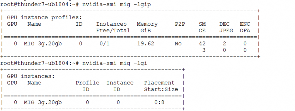 sudo docker run –runtime=nvidia -e NVIDIA_VISIBLE_DEVICES=MIG-GPU-786035d5-1e85-11b2-9fec-ac9c9a792daf/0/0 nvidia/cuda nvidia-smi