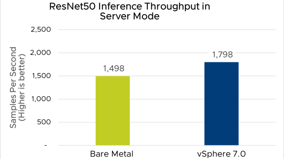 One of our experiments achieved 20% better inference throughput compared to bare metal results, mainly due to the vSphere support of oversubscription (aka over-commitment) of logical cores. vSphere allows for large oversubscriptions of hardware resources to enable multiple workloads to be run simultaneously and still provide quality of service and meet service-level agreements. This is a unique feature of vSphere performance that we take advantage of in our benchmarking; vSphere oversubscription can also be applied in real-world scenarios for ML/DL workloads.
