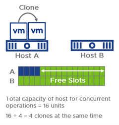 Starting out, with no clones, we have 16 potential units (shown as free slots in Figure 1) that we can use for cloning operations (or vMotion, or relocate). But if we decide to clone a new VM on Host A itself, then we consume two slots for Host A as the source and then 2 slots for Host A as the destination. We thus consume 4 total slots. Since a host has 16 units available, if we wanted to clone a number of VMs from Host A to Host A, then we can have only 4 cloning operations happening at the same time (Figure 2).