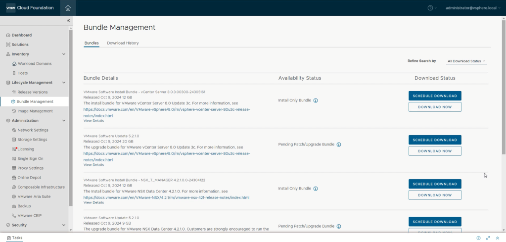 - Upgrade Components – Upgrade each of the vSphere components (vCenter and ESX). SDDC Manager will use the appropriate sequencing to ensure compatibility with the VCF 5.2 Bill of Materials.