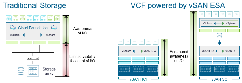 Figure. Comparing visibility and control of I/O with traditional storage versus vSAN.