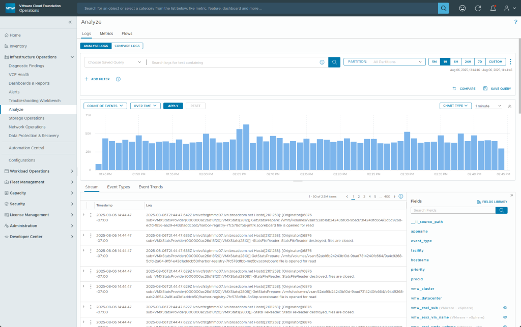 When administering a VCF environment powered by vSAN, we can’t overlook the insight gained from log analysis. The “Infrastructure Operations” > “Analyze” presents a basic view of log data captured by VCF Operations for Logs. This view within VCF Operations represents a basic integration between the two tools. A full collection of comprehensive dashboards with predefined filtering for vSAN can be found connecting the the appliance providing VCF Operations for Logs