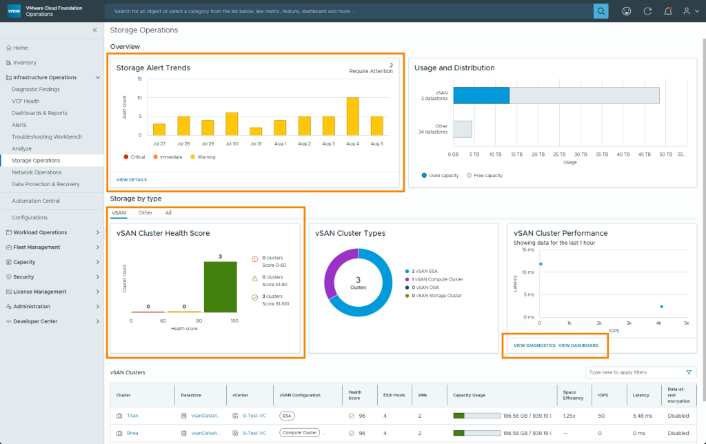 With several clickable links, the view also serves as a launching point for other insights, such as cluster-specific analysis. However, two of the links: “View Dashboard” and “View Diagnostics” lead to other areas in VCF Operations that assist with vSAN administration across your entire VCF instance.