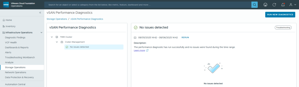 Within the Storage Operations View, clicking on “View Diagnostics” leads you to a vSAN Performance Diagnostics page. This allows you to produce a sanity check for your vSAN ESA clusters, where you can select one of two diagnostics goals: Troubleshooting, which is intended for a production cluster, or Benchmarking, which is geared for new clusters prior to moving into production.