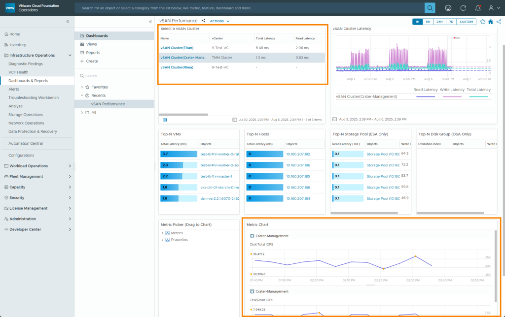 vSAN in a VCF environment is different. vSAN is a part of the hypervisor. Using its own scheduler, I/O is visible and managed from end to end, regardless if it is deployed as an aggregated vSAN HCI cluster, or disaggregated using vSAN storage clusters. This awareness and control is what has always given vSAN unique abilities to provide unique metrics about the behavior of I/O. APIs make this data readily available in VCF Operations.