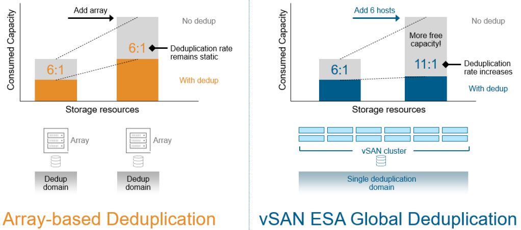 vSAN global deduplication is different. It takes advantage of vSAN distributed scale-out architecture. The vSAN cluster is the deduplication domain, which means that as additional hosts are added, the deduplication domain automatically grows, increasing the probability of duplicate data, and delivering an increasing deduplication ratio.