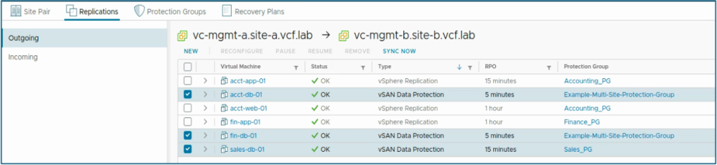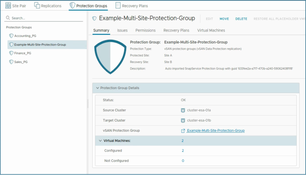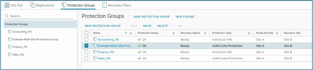 If we switch our view to this interface, you will see this is shown below for our “Example-Multi-Site-Protection-Group” policy that has been imported into the protection group inventory along with existing protection groups defined solely within the protection and recovery orchestration UI.