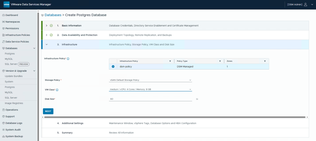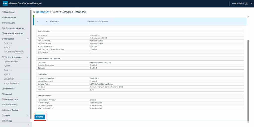 VMware DSM simplifies the deployment and management of databases. Follow these steps to provision a highly available PostgreSQL instance:
