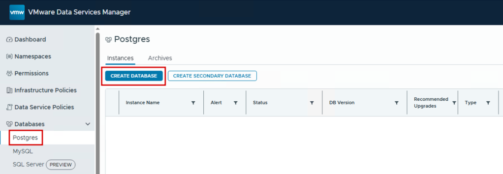 - Create a PostgreSQL Instance: Navigate to Databases > Postgres and click on Create Database.