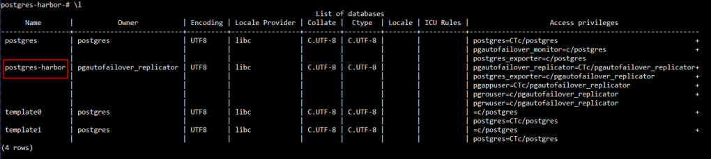Once connected, list all databases to confirm the postgres-harbor database exists: