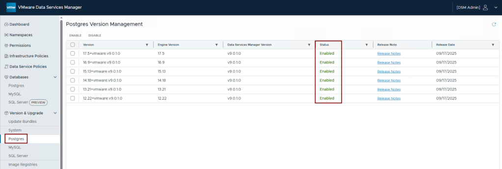 - VMware DSM: Used to provision and manage the PostgreSQL database instance. Follow the guide for installing and configuring DSM on VCF 9.0