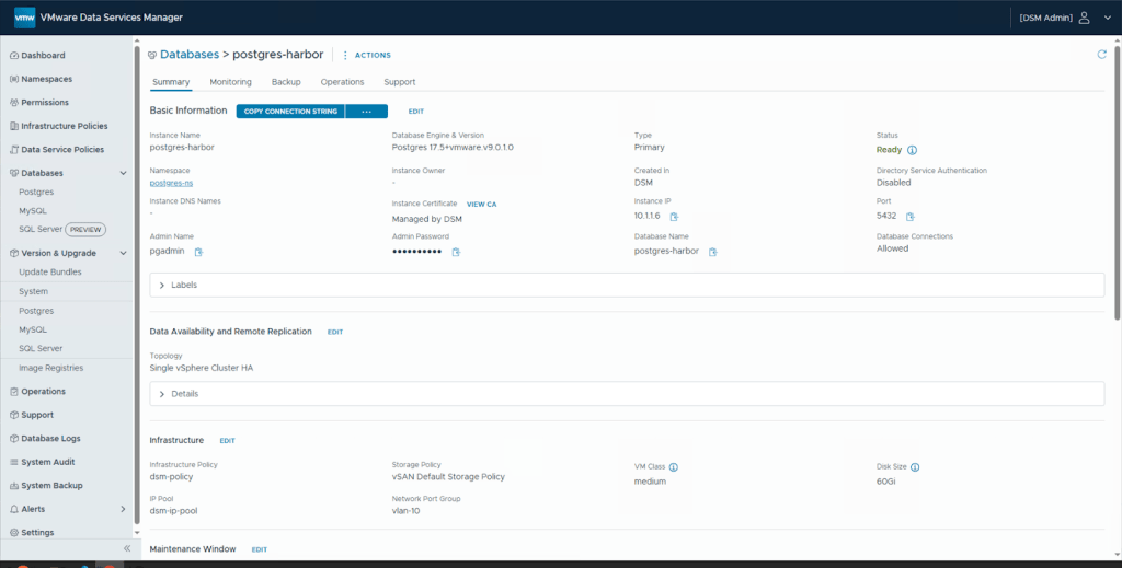 - Leverage DSM for Operations: One of the key advantages of using VMware DSM is simplified database lifecycle management. Any future database operations can be managed and automated efficiently through the DSM console: