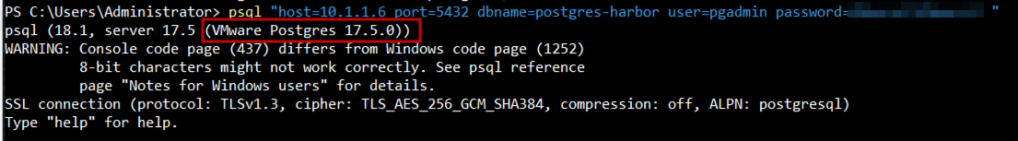 psql "host=10.1.1.6 port=5432 dbname=postgres-harbor user=pgadmin password=db-password" |