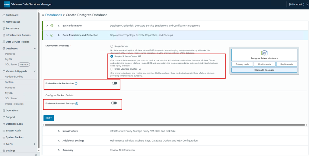 - Configure Data Availability and Protection: We select HA in a vSphere cluster. This provides us with a highly available database instance. Additionally, enable remote replication to another instance if desired (for disaster recovery) and backup scheduling (for data protection and compliance).