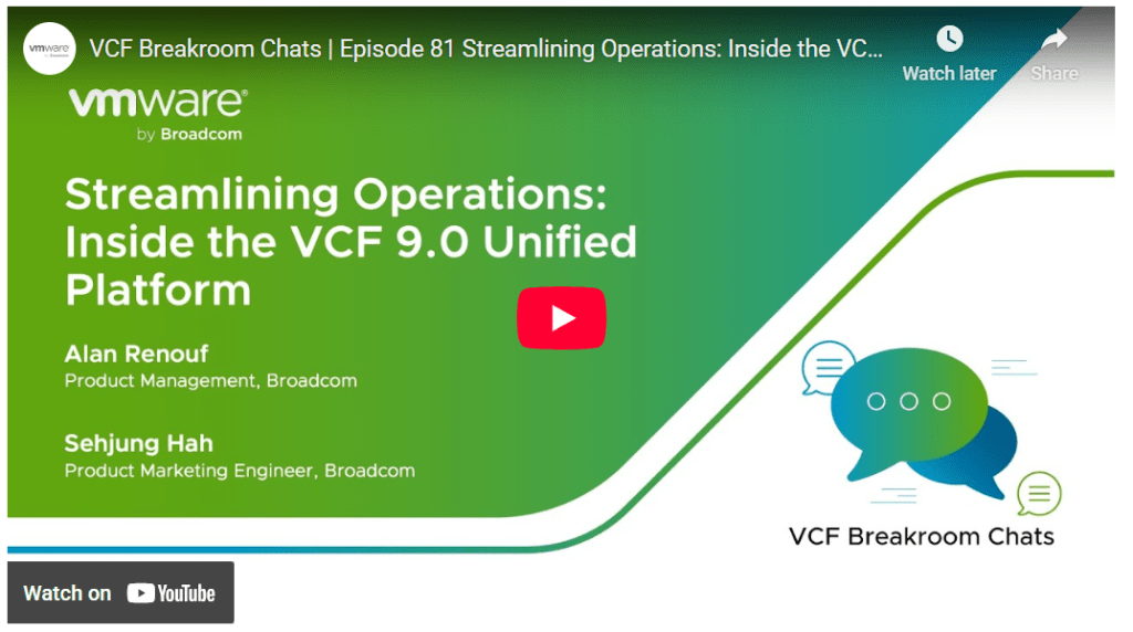 Watch the latest episode of VCF Breakroom Chats. In Episode 81, Alan Renouf and Sehjung Hah discuss how VCF 9.0 transforms VMware infrastructure into a true private cloud. By building on operational improvements and enhanced visibility into metrics and costs, VCF 9.0 introduces: