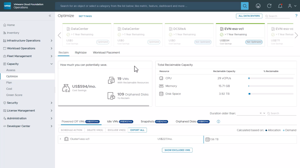 You can get more information about capacity management in the following deep dive blog. To learn more about VMware Cloud Foundation Operations check out our webpage.