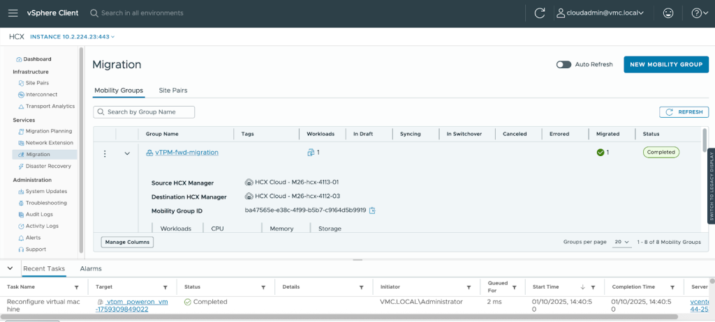The image below shows HCX Bulk Migration of vTPM VM from on-premises to a VMC SDDC: