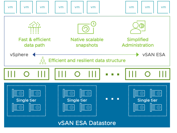 • Optimized Write Path: ESA writes data directly to the storage pool, eliminating the cache-capacity tier staging process used in OSA. This results in lower latency and improved consistency for write operations.