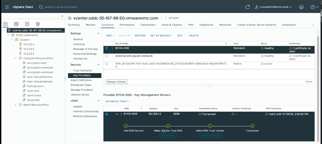 Add the KMS in vCenter and establish trust. For detailed steps and screenshots, please refer to Add Standard Key Provider using vCenter Client.