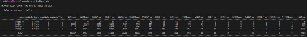 1. Configure VM parameters: Add sched.mem.lpage.enable1GPage = "TRUE" to the VM’s advanced parameters. Before powering on the VM, you can verify the availability of various page sizes by running memstats -r buddy-stats on the ESX host. The following screenshot shows there are a total of  2023 1GB free pages in ESX on a 2TB memory server. Then specify your desired memory size for the VM and power it on.