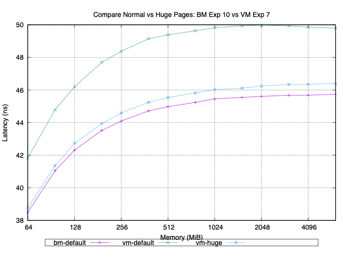 We also conducted our testing on a few different Sapphire Rapids servers.  Our results were consistent across all of them.  With 4 KB (small) pages, we consistently saw about a 5% increase in latency on the VM compared to the bare metal run on the same machine.  When we configured the memtest application to use huge pages (2 MB or 1 GB), the latency of both the VM and bare metal was reduced.