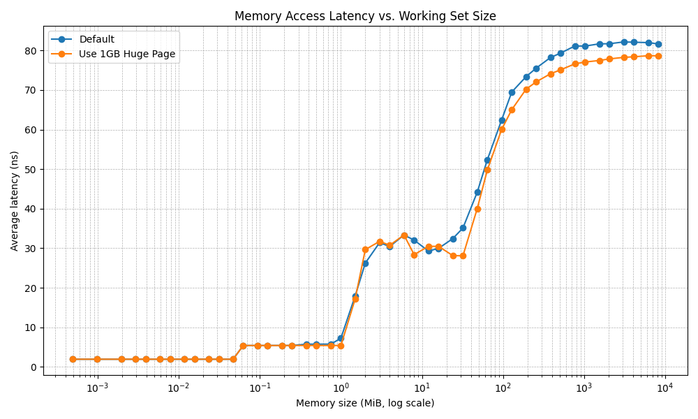 The results show a consistent improvement in latency when employing 1 GB huge pages, particularly when the working set size exceeds the L3 cache size.