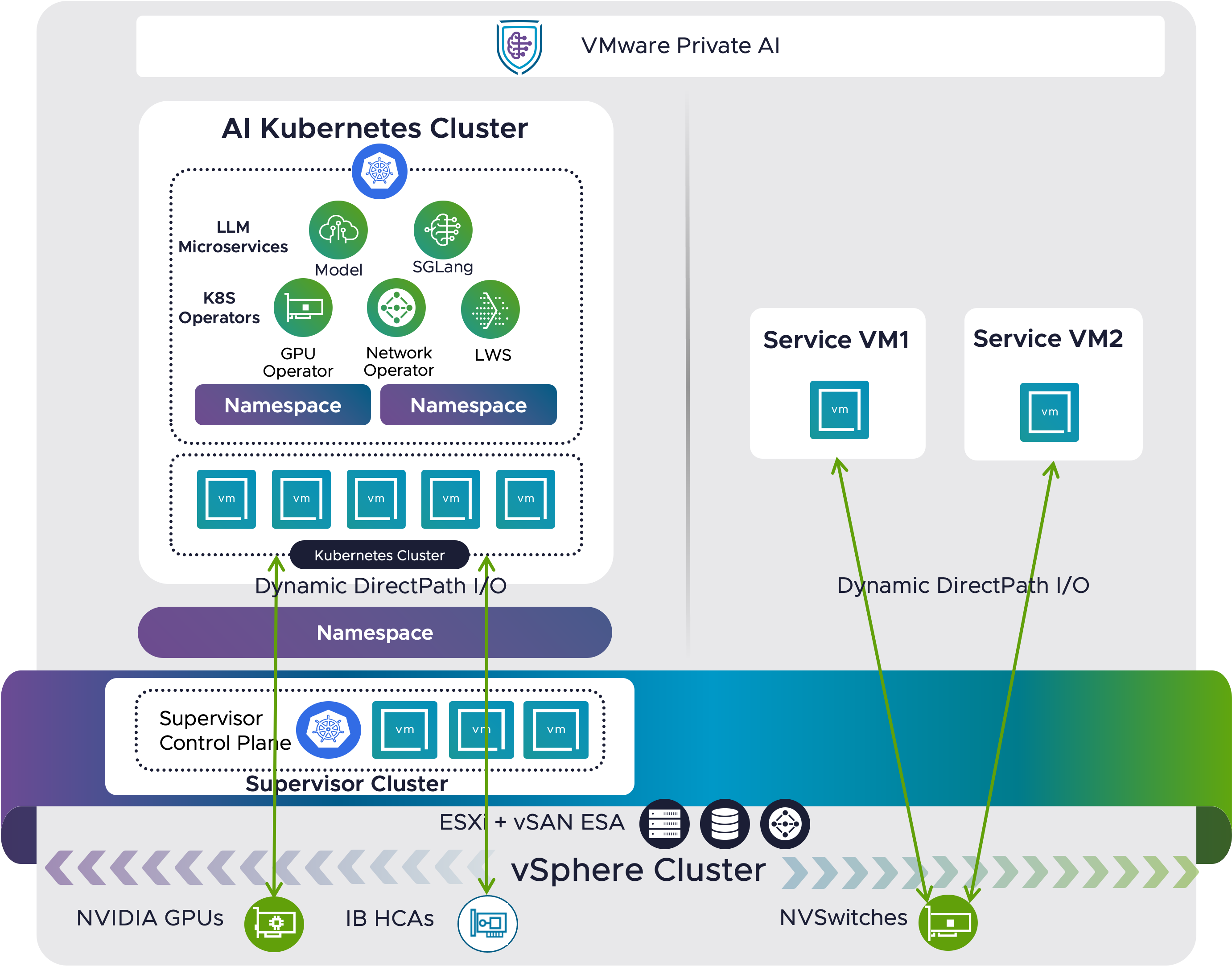 The solution architecture is broken down into the VKS Cluster, Supervisor Cluster, and critical Service VMs running the NVIDIA Fabric Manager. It highlights the use of Dynamic DirectPath I/O to ensure GPUs and NICs are directly accessible to workload VKS nodes, while NVSwitches are passthrough to Service VMs.