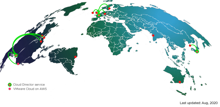 VMware Cloud Director™ service has been available since May 2020 in US West region. Now the solution has a global presence with CDs available in Frankfurt and Tokyo. Having a global footprint means cloud providers can utilize VMware Cloud Director service in their geo to manage infrastructure in their nearest VMware Cloud on AWS datacenter – as long as the latency between data centers is less than 150ms*