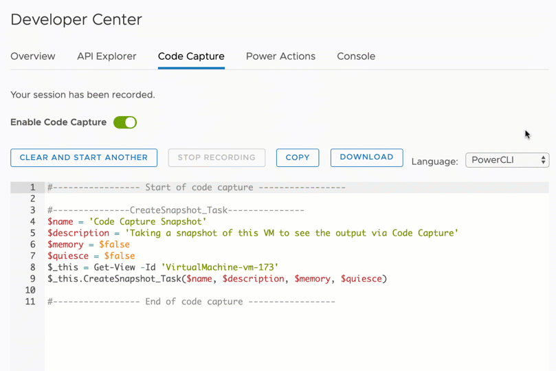 The last several updates to the vSphere Client Developer Center has added a lot of functionality to Code Capture. The first release only supported low-level, API based, PowerCLI output. Since then, we have cleaned up the formatting of the outputted code and added two new languages, JavaScript and Python. With this latest release, we’re introducing support for Go by way of govmomi!