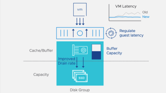 Se logra un rendimiento de aplicación más predecible en vSAN 6.7 U3 al eliminar los datos del búfer de escritura al nivel de capacidad. Esto hace que vSAN sea más eficiente y consistente con un mayor rendimiento para escrituras secuenciales. La mayor consistencia en las operaciones de desestabilización da como resultado una desviación menor entre latencia alta y baja. Este aumento en el rendimiento también reduce la cantidad de tiempo necesario para resincronizar tareas de reparación y reconstrucción.