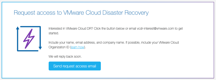 Suponemos que ya solicitó y adquirió el servicio VMware Cloud Disaster Recovery para su configuración de servicios en la nube. De lo contrario, simplemente busque “VMware Cloud DR” en su VMware Cloud Services Portal (CSP) y solicite acceso como se muestra aquí: