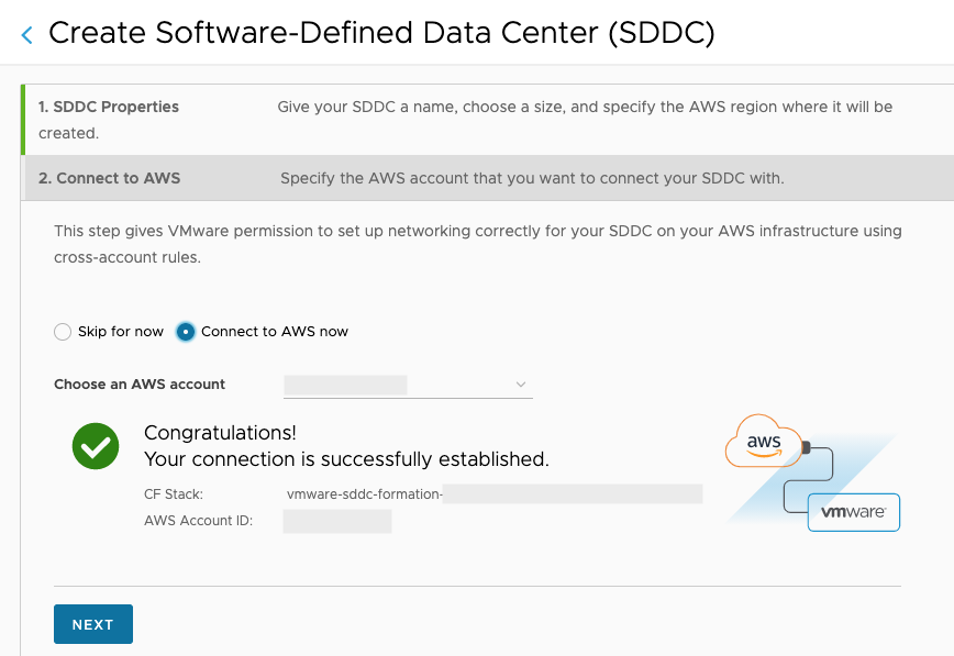 En el paso 2 de la figura siguiente se muestra un ejemplo de este proceso de conexión de cuenta de AWS parcial. Puede salir de la operación de implementación del SDDC una vez que se haya realizado la conexión a la cuenta de AWS y se haya creado correctamente el Cloud Formation Stack.