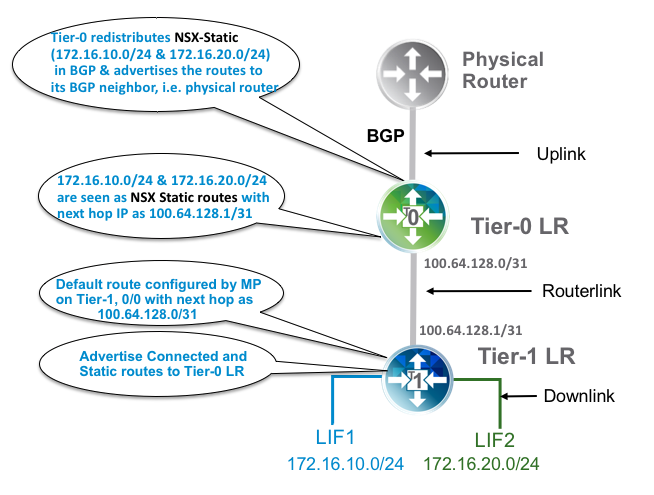 To provide reachability to subnets connected to the Tier-1 LR, the Management Plane (MP) configures static routes on the Tier-0 LR for all the LIFs connected to Tier-1 LR with a next hop IP address as Tier-1 LR Routerlink IP (100.64.128.1, in the following topology). 172.16.10.0/24 and 172.16.20.0/24 are seen as NSX Static routes on Tier-0 LR. Figure 2: Route advertisement on Tier-1 and Tier-0 LR