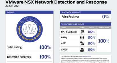 According to the results from SE Labs, VMware NSX NDR provides 100 percent protection across multi-cloud environments from four major advanced and persistent threats (APT) groups—including FIN7&Carbanak, OilRig, APT3 and APT29—while returning zero false positives. This ability allows security operations teams to rapidly detect malicious activity and stop the lateral movement of threats inside the network.
