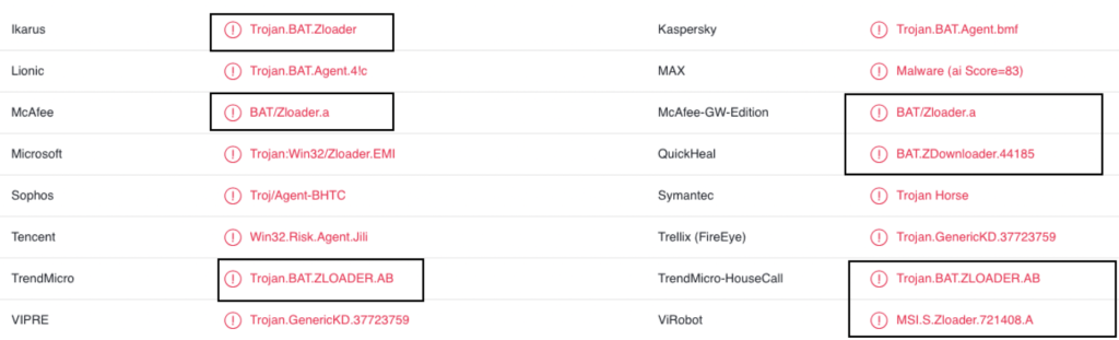 While researching the pre-existing information on BatLoader published on the public internet, there seemed to be some confusion as to whether BatLoader and Zloader, a banking trojan, are one and the same. For example, looking up this file on VirusTotal we see that different antivirus engines group it in the Zloader malware family. The same file has been referenced in community-contributed IOC collections for both Zloader and Batloader.