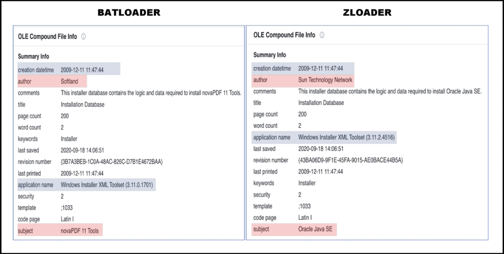 With these similarities, we cannot conclude that these malware variants are entirely separate from each other, and of further note, some of the collected samples of Batloader and ZLoader both had an identical creation date and time within the file’s OLE metadata.