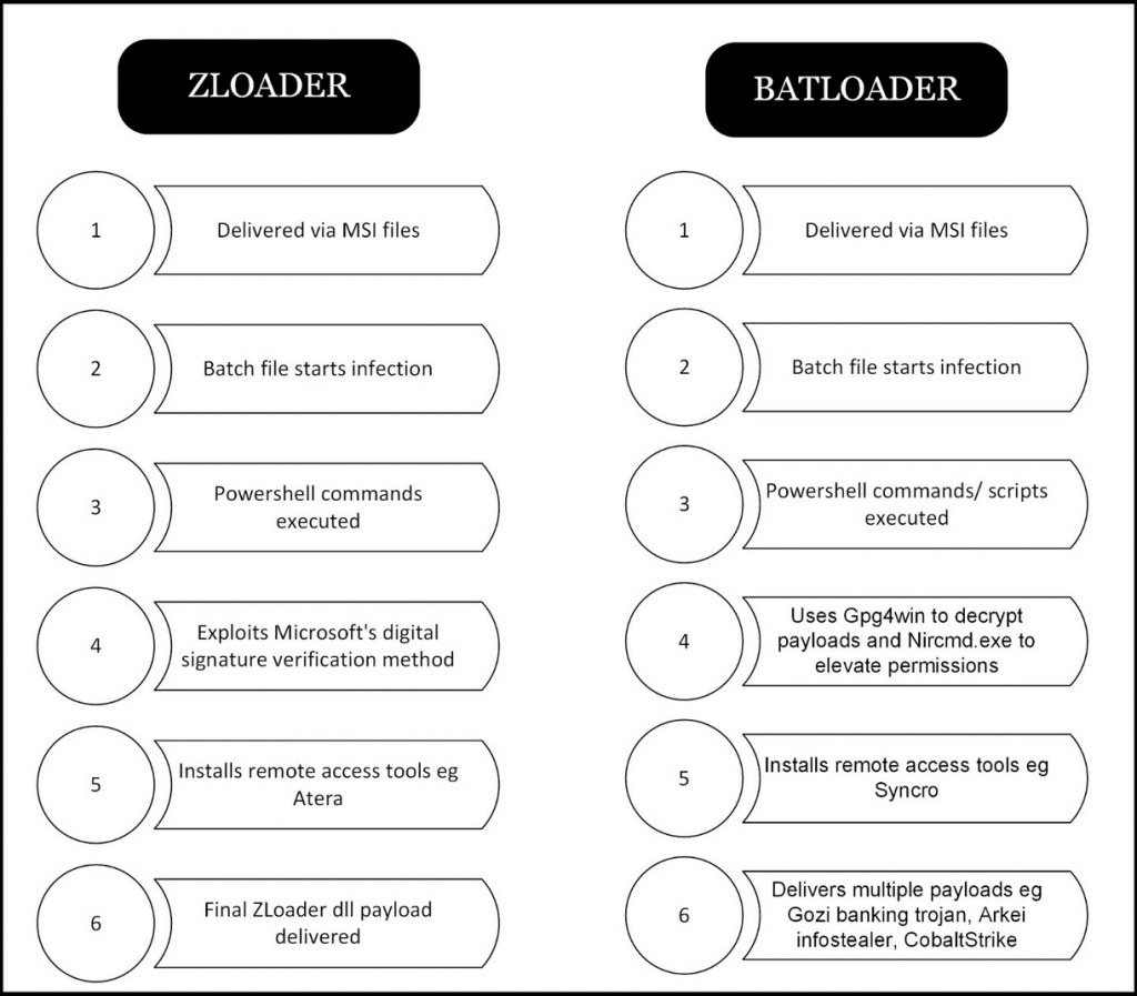Figure 4: Comparing ZLoader (most recent campaign) and BatLoader attack chain