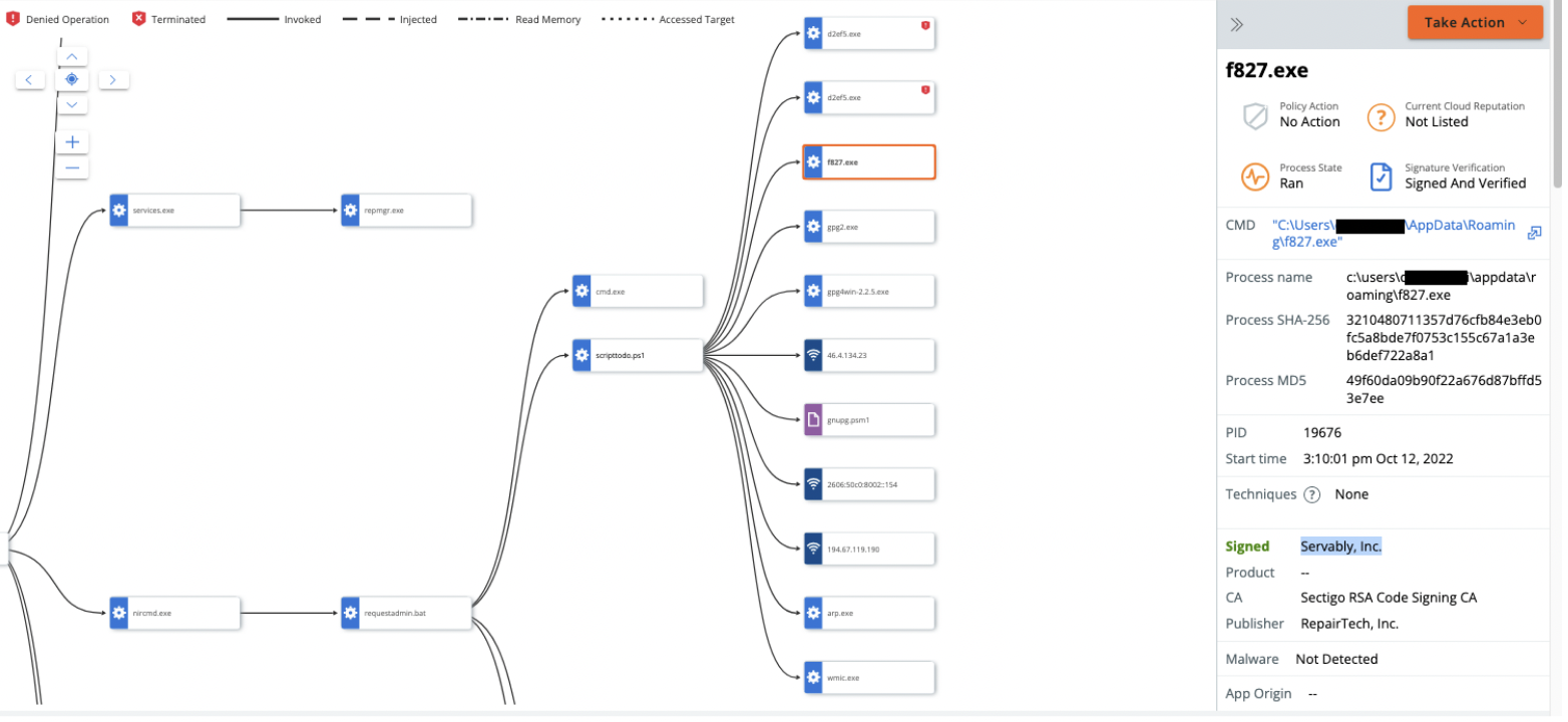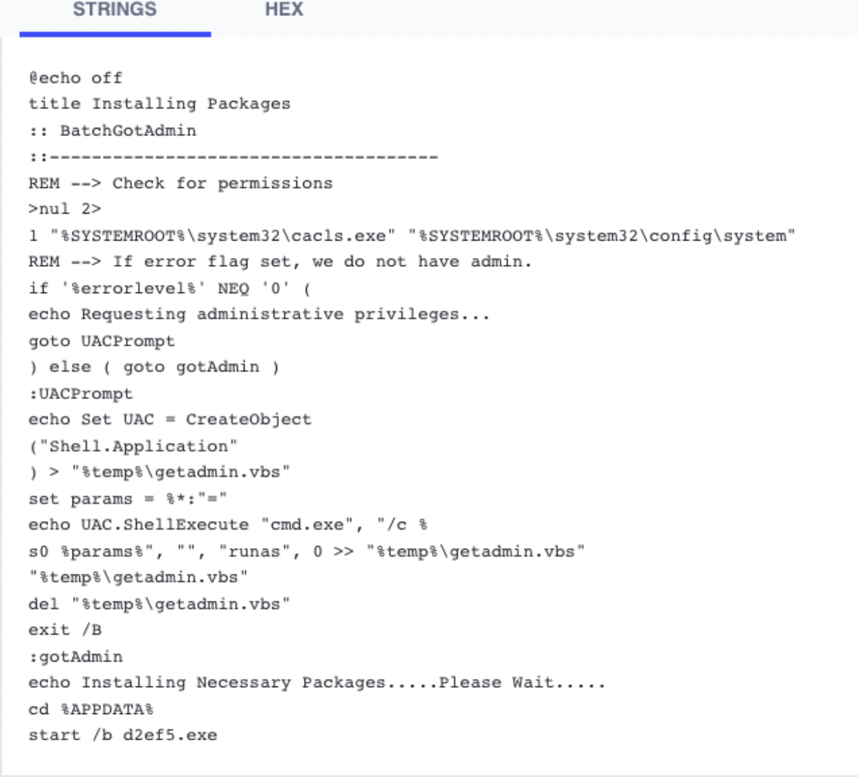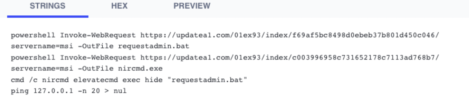 The infection chain relies on batch scripts and PowerShell scripts written to the \appdata\roaming directory to gain initial access. update.bat downloads requestadmin.bat and nircmd.exe, a command line utility that can be used to gain admin privileges with the “elevate” and “elevatecmd” switches.