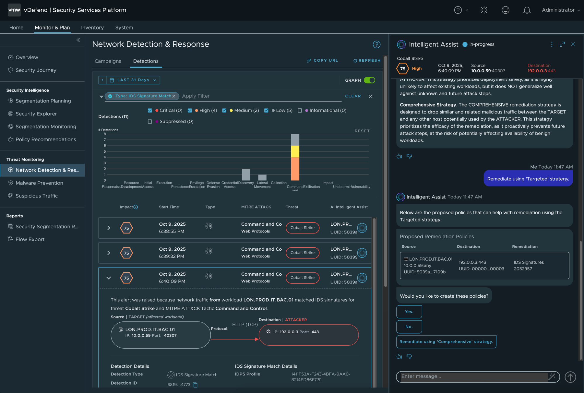 Since each exported detection event is also paired with a link pointing back to ATP, the following showcases how to effectively respond and remediate using Intelligent Assist for VMware vDefend, an interactive chatbot powered by a Large Language Model (LLM) deeply integrated into vDefend user interface. This co-pilot explains detection events in plain English, helping security teams comprehend the full impact of threats while accelerating the remediation process.