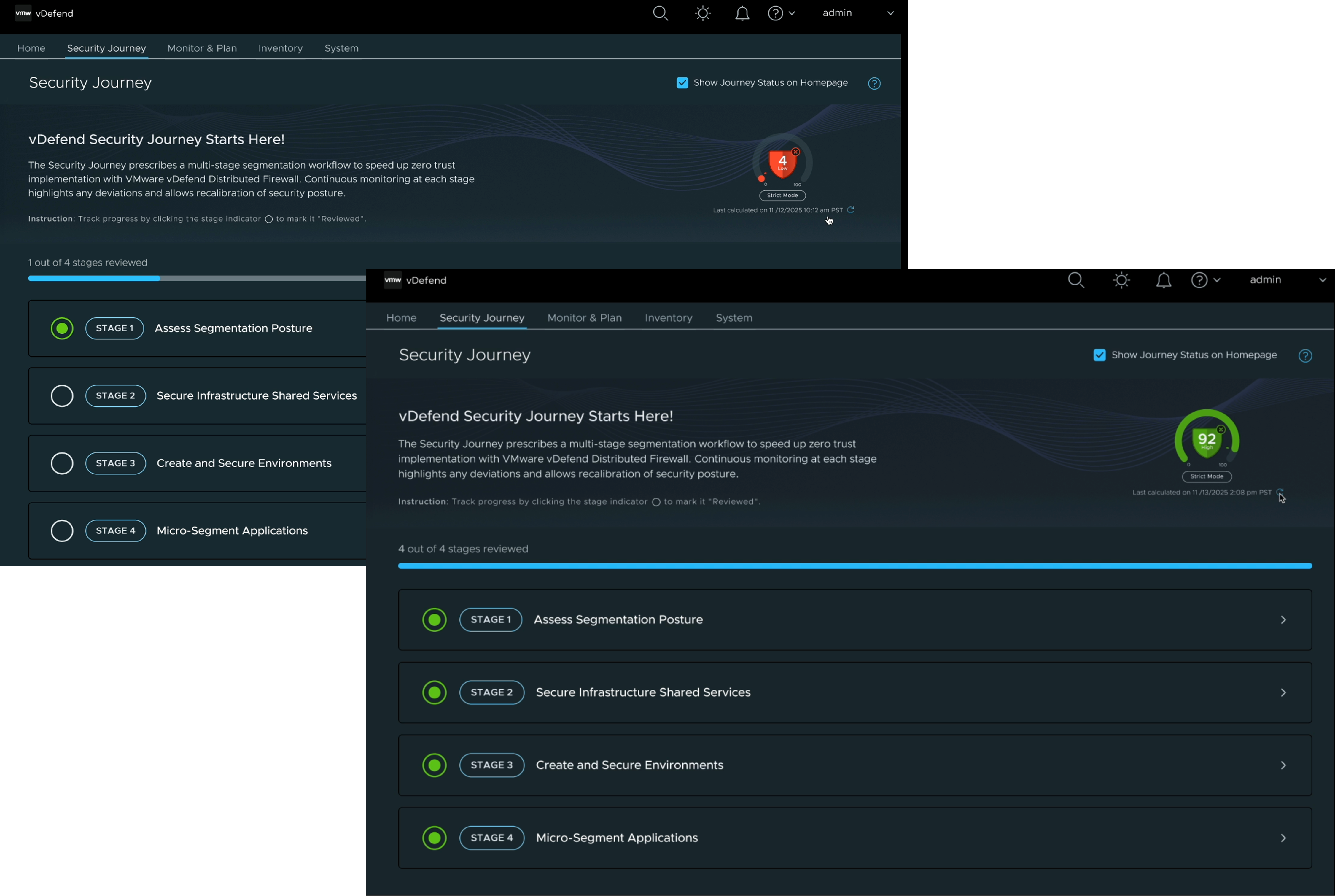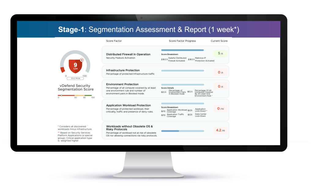 With DFW 1-2-3-4 multi-stage security journey, a typical Zero Trust deployment can be rolled out in as little as a few weeks – comprehensively, systematically, and most of all, with confidence. Starting with an initial low-scoring assessment, the post-deployment high score validates the improvement to the organization’s security posture.
