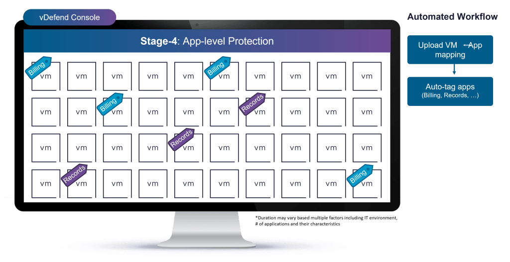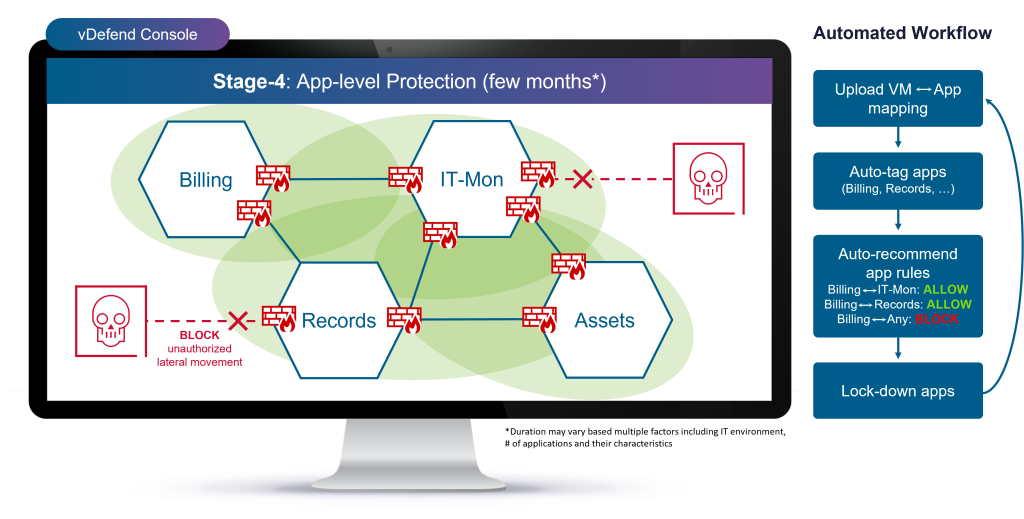 vDefend is purpose-built to auto-discover application communications, provide guidance on security rules, and verify policy correctness in a non-disruptive manner. The result: 360-degree segmentation with built-in automated workflows that include both macro- and micro-segmentation and continuous monitoring, all in a prescriptive manner.