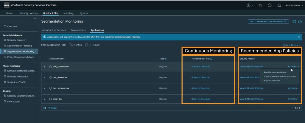 Users can monitor traffic leakage between zones and ask the system for either the list of traffic or a set of recommended rules that can then be granted exceptions. DFW 1-2-3-4 continuously monitors for these leakages and alerts the users to take action on newly discovered leakages. This phase ensures that environments remain isolated, minimizing cross-environment exposure and tightening your organization’s overall security posture.