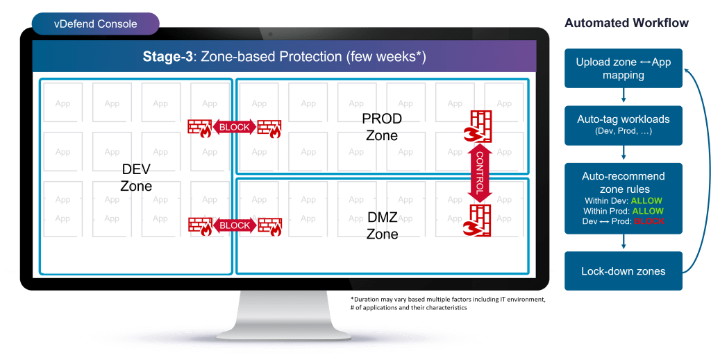 Zero Trust for datacenter traffic requires defining controls for each application. In this stage, there are three steps: a. defining application boundaries used to convert them into tags and groups; b. defining application ring-fencing controls that control over which ports and protocols communication is allowed; c. defining micro-segmentation by defining controls within each application across tiers (web front end, application server and database). This fine-grained segmentation not only enforces least privilege but also strengthens resilience against east-west threats.