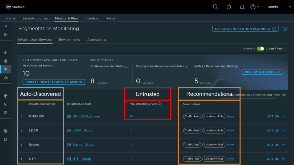 Start with the foundational layer of your datacenter – shared services such as DNS, NTP, Syslog, SNMP, DHCP, and LDAP/LDAPs. DFW 1-2-3-4 automatically discovers infrastructure services to identify service endpoints and allows the user to validate and automatically create protection rules to these services. Alternatively, users can feed their known infrastructure service endpoints via CSV file for the system to add infrastructure services. This step delivers quick security gains with minimal disruption—the ideal “low-hanging fruit” for teams beginning their Zero Trust journey. Locking down these services, especially DNS servers, allows the user to remove the most common Command & Control (C&C) and exfiltration paths for malicious actors.
